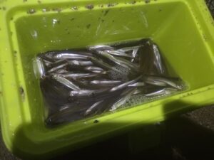 平日の夜にも関わらず、狙いの小川は、30名ほどの大盛況・・・。やはり、人が多いと遡上するワカサギも少ないみたいで、ポツリポツリと掬える感じが続きました。