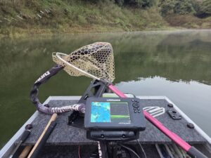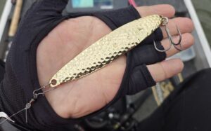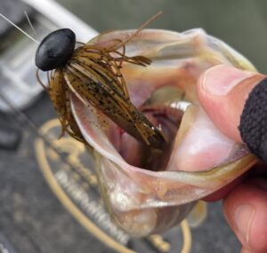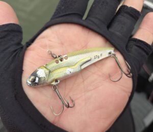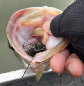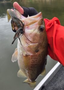 この水深でのミニスコーンジグによるリフト&カーブフォール戦略は、ちょっと慣れないと難しい感じではありますが、動作自体は簡単ですので、繰り返しやってもらえればと思います。