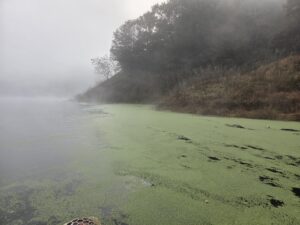 具体的に狙った場所は、ボディーウォーターに面した、少しだけ凹んだバンク沿いにあるブッシュ+浮草エリアです。